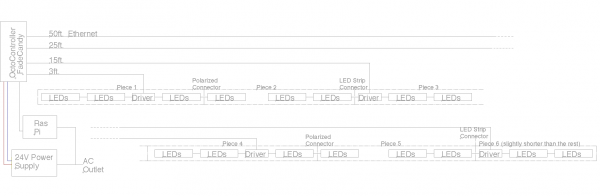 For the CandyBar, the same power scheme that Dan used in his Luminescence project was used, scaled for my purposes: a single 24V/250W power supply, which then delivers 5V to each subsequent DualDriver board at up to 30 Watts per pair of LED strips (2x1 meter segments).