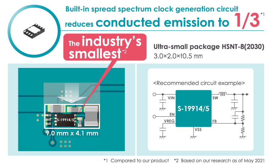 ABLIC's S-19914/5 series reduce conducted emission to about 1/3, making it an ideal small single chip