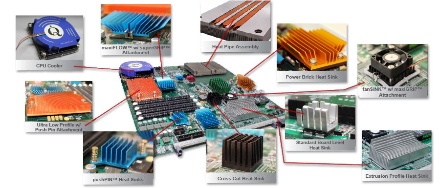 maxiFLOW heat sinks include an integral pushPIN mounting system for fast, safe attachment of the heat sinks onto BGAs and other hot components.